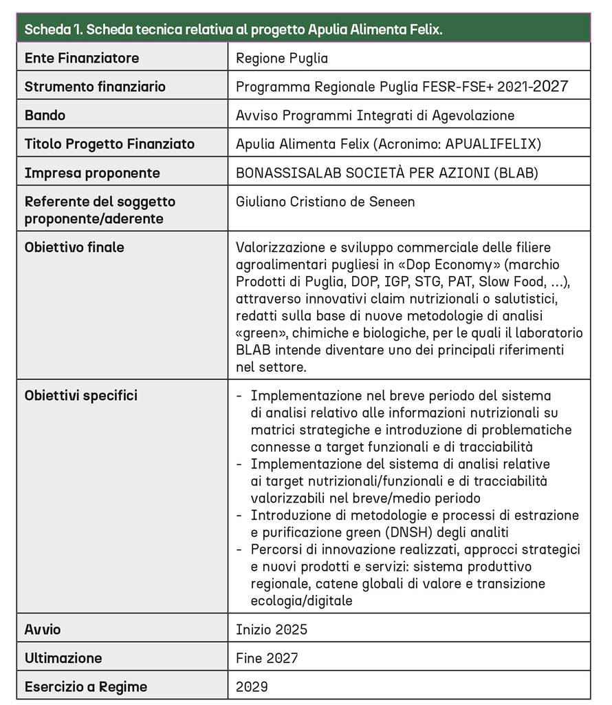 Il progetto favorirà il riconoscimento di BonassisaLab come top player dell’agroalimentare di territorio e delle evoluzioni nell’analisi e nel controllo dei prodotti alimentari. Gli obiettivi del progetto Apulia Alimenta Felix, sono di seguito riassumibili in: valorizzazione e sviluppo commerciale delle filiere agroalimentari pugliesi in Dop Economy (marchio prodotti di Puglia, DOP, IGP, STG, PAT, Slow Food) attraverso claim nutrizionali o salutistici e intercettando trend innovativi, dimostrabili sulla base di nuove metodologie di analisi green, chimiche e biologiche, per le quali il laboratorio BonassisaLab intende diventare uno dei principali riferimenti nel settore; implementazione nel breve periodo del sistema di analisi relativo alle informazioni nutrizionali su matrici strategiche e introduzione di problematiche connesse a target funzionali e di tracciabilità; implementazione del sistema di analisi relative ai target nutrizionali/funzionali e di tracciabilità valorizzabili nel breve/medio periodo; introduzione di metodologie e processi di estrazione e purificazione green (DNSH) degli analiti; percorsi di innovazione realizzati, approcci strategici e nuovi prodotti e servizi: sistema produttivo regionale, catene globali di valore e transizione ecologia/digitale. Le attività progettuali sono orientate a realizzare uno scouting di tutte le informazioni scientifiche, caratteristiche nutrizionali note e latenti, evidenziabili in prodotti agroalimentari tradizionali della Puglia, tipici e certificati (marchio Prodotti di Puglia, DOP, IGP, STG, PAT, Slow Food) che di fatto, come detto, rappresentano il sistema della Dop Economy.