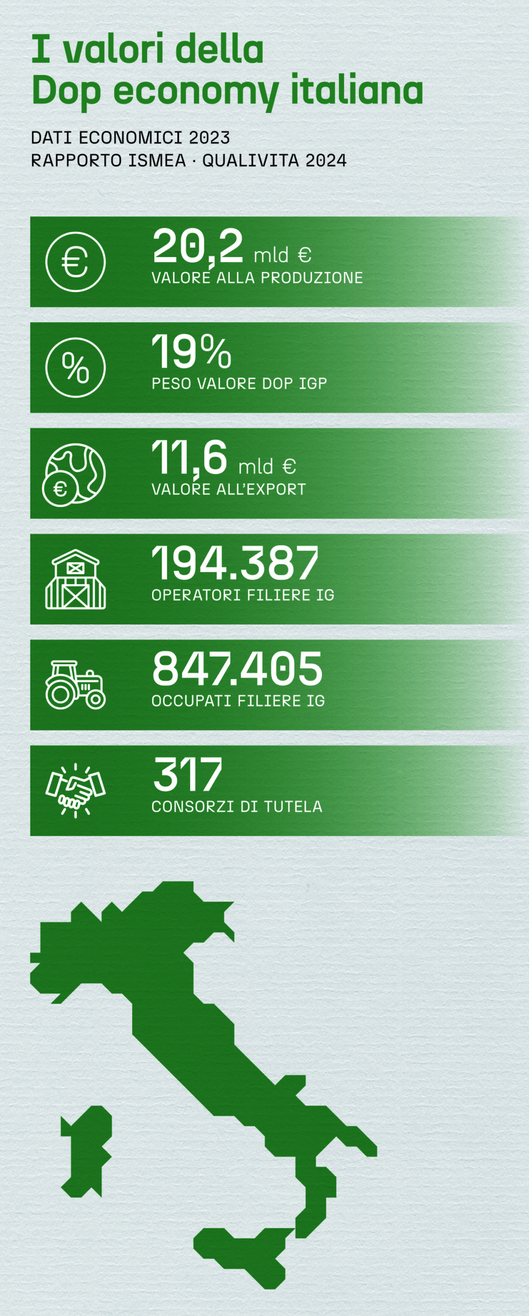 La Dop Economy rappresenta il sistema economico e produttivo del comparto agroalimentare e vitivinicolo a “Indicazione Geografica” (DOP, IGP, STG). Il termine Dop Economy è stato introdotto per la prima volta nel 2018 da Mauro Rosati, nella relazione al XVI rapporto Ismea-Qualivita sulle produzioni agroalimentari e vitivinicole italiane DOP, IGP e STG dal titolo “La Dop Economy sostiene la crescita culturale, turistica e sociale del Paese”. Dal 2018 in poi il concetto di Dop Economy è stato ripreso da molti stakeholder, studiosi e rappresentanti delle istituzioni, quindi rilanciato da numerosi media, entrando stabilmente nel dibattito pubblico. Nel 2021 il termine Dop Economy è entrato nel vocabolario Treccani, sezione “neologismi”. Secondo il XXIII rapporto Ismea-Qualivita, la Dop Economy italiana raggiunge 20,7 miliardi € di valore alla produzione nel 2024, registrando una crescita del 25% rispetto al 2020 e contribuendo per il 19% al fatturato complessivo dell’agroalimentare nazionale.