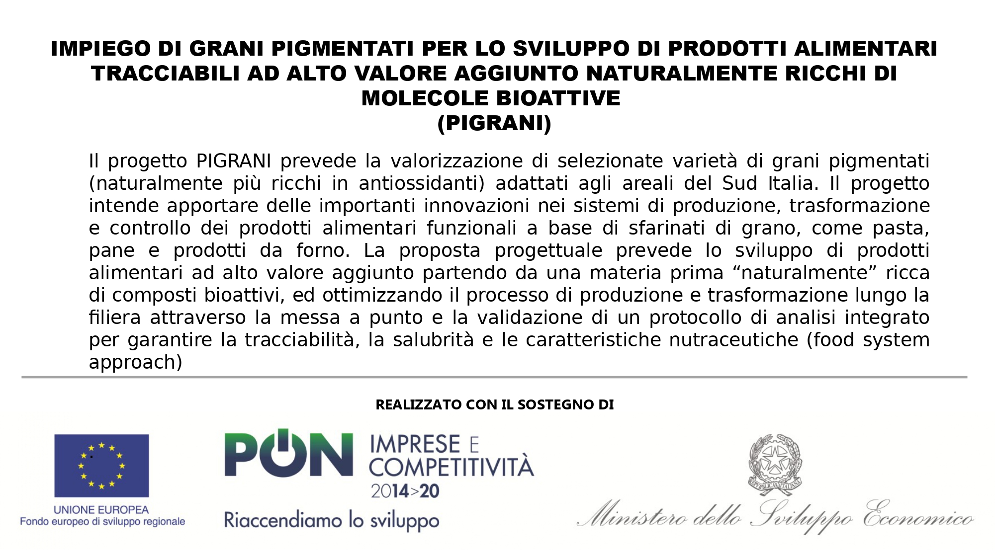 BonassisaLab è partner scientifico del progetto PIGRANI (realizzato con il sostegno di Unione Europea, Fondo europeo di sviluppo regionale / PON Imprese e Competitività 2014/20 Riaccendiamo lo sviluppo / Ministero dello Sviluppo economico), che prevede la valorizzazione di selezionate varietà di grani pigmentati (naturalmente più ricchi in antiossidanti) adattati agli areali del Sud Italia. Il progetto intende apportare delle importanti innovazioni nei sistemi di produzione, trasformazione e controllo dei prodotti alimentari funzionali a base di sfarinati di grano, come pasta, pane e prodotti da forno. La proposta progettuale prevede lo sviluppo di prodotti alimentari ad alto valore aggiunto partendo da una materia prima “naturalmente” ricca di composti bioattivi, ed ottimizzando il processo di produzione e trasformazione lungo la filiera attraverso la messa a punto e la validazione di un protocollo di analisi integrato per garantire la tracciabilità, la salubrità e le caratteristiche nutraceutiche (food system approach).
